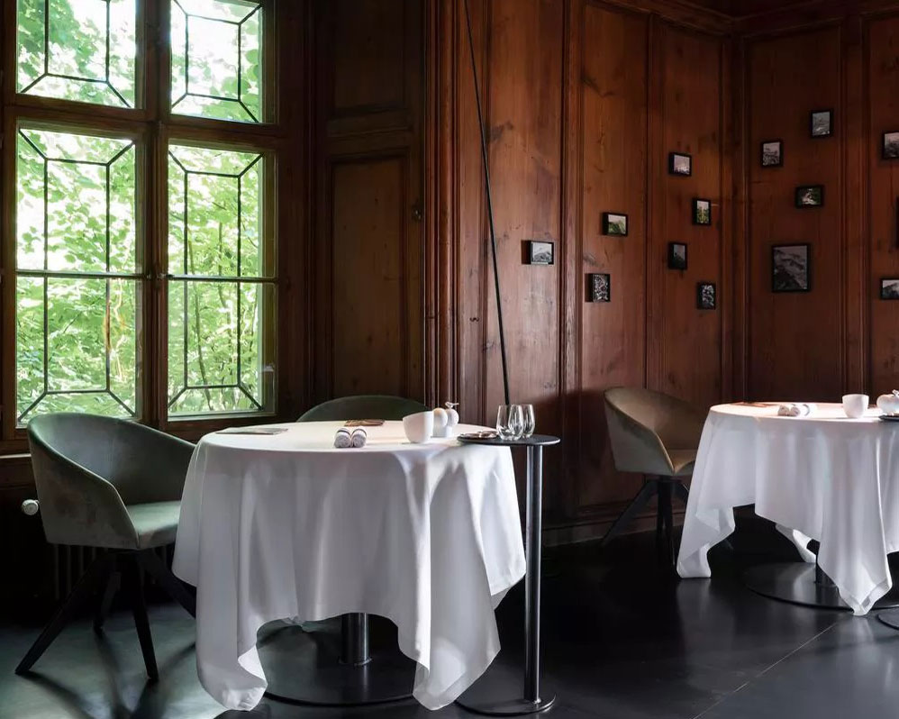 Les salles à manger sont ornées de détails architecturaux raffinés, reflétant le caractère historique du bâtiment tout en intégrant des éléments contemporains. Les tables sont élégamment dressées, offrant un cadre sobre et raffiné qui met en valeur la cuisine créative et délicate du chef Caminada.